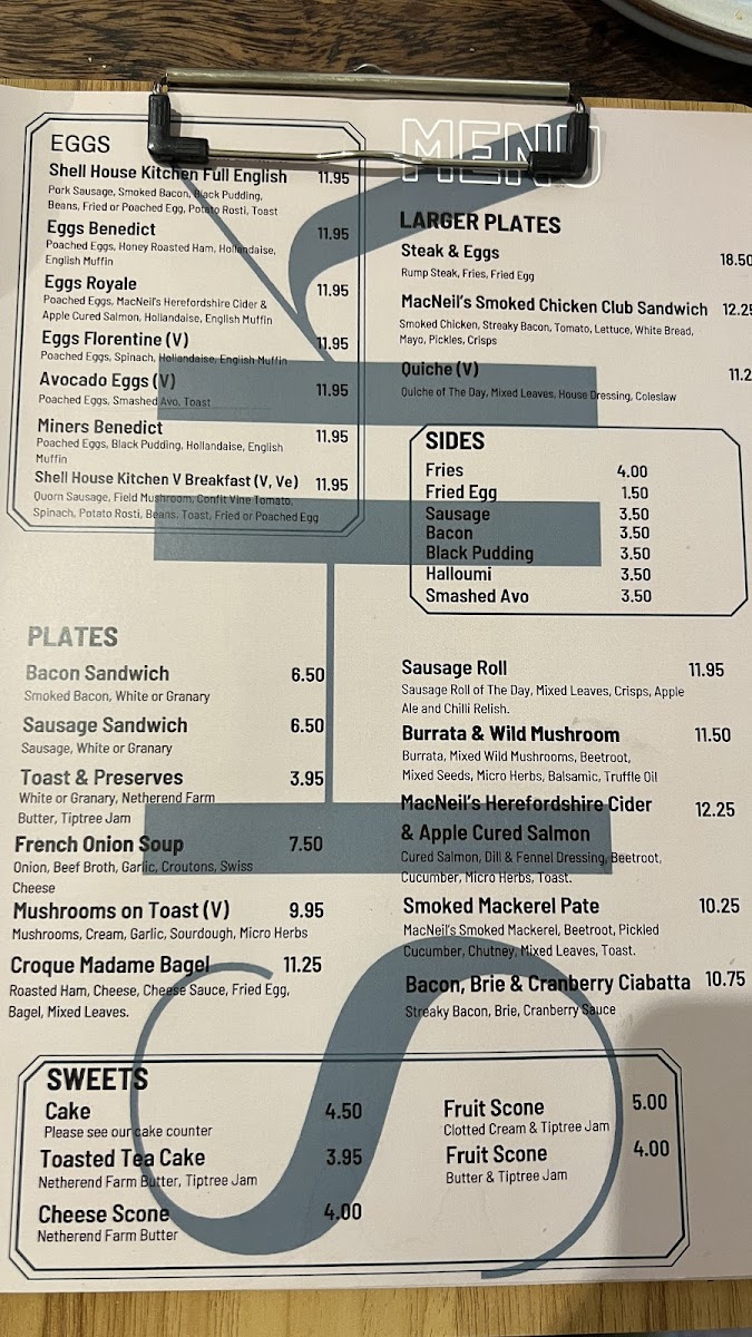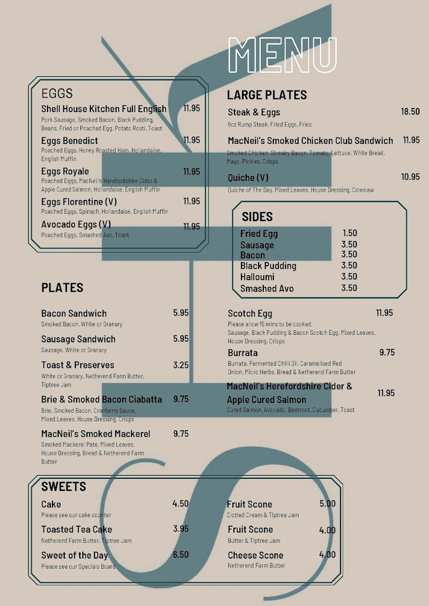 From a reviewer's perspective, the menu at Shell House Kitchen at 36 The Homend, Ledbury, presents a thoughtful balance of classic breakfast favorites and hearty plates. Egg lovers will be drawn to offerings like the Shell House Kitchen Full English, Eggs Benedict, Eggs Royale, Eggs Florentine, and Avocado Eggs, each promising a generous and satisfying start to the day. For those seeking more substantial meals, the Steak & Eggs, Macneil's Smoked Chicken Club Sandwich, and Quiche provide flavorful and filling options, complemented by sides such as Fried Egg, Sausage, Bacon, Black Pudding, and Halloumi for extra indulgence. Lighter plates include the Bacon Sandwich, Sausage Sandwich, Toast & Preserves, and Macneil's Smoked Mackerel, ideal for a quick yet satisfying bite. The menu’s sweet selection is equally inviting, featuring treats like Cake, Fruit Scone, Toasted Tea Cake, Sweet Of The Day, and Cheese Scone, which round off the meal with a comforting, homey touch. Overall, the menu at Shell House Kitchen is versatile, offering something for every taste-from traditional English breakfast classics to wholesome, satisfying mains and delectable sweets.